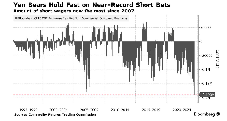 根据商品期货交易委员会(CFTC)截至7月2日当周的数据,非商业交易者(如对冲基金和大型投机者)目前持有约189560份押注未来几周日元将下跌的合约(价值约147亿美元),为2007年以来最多。