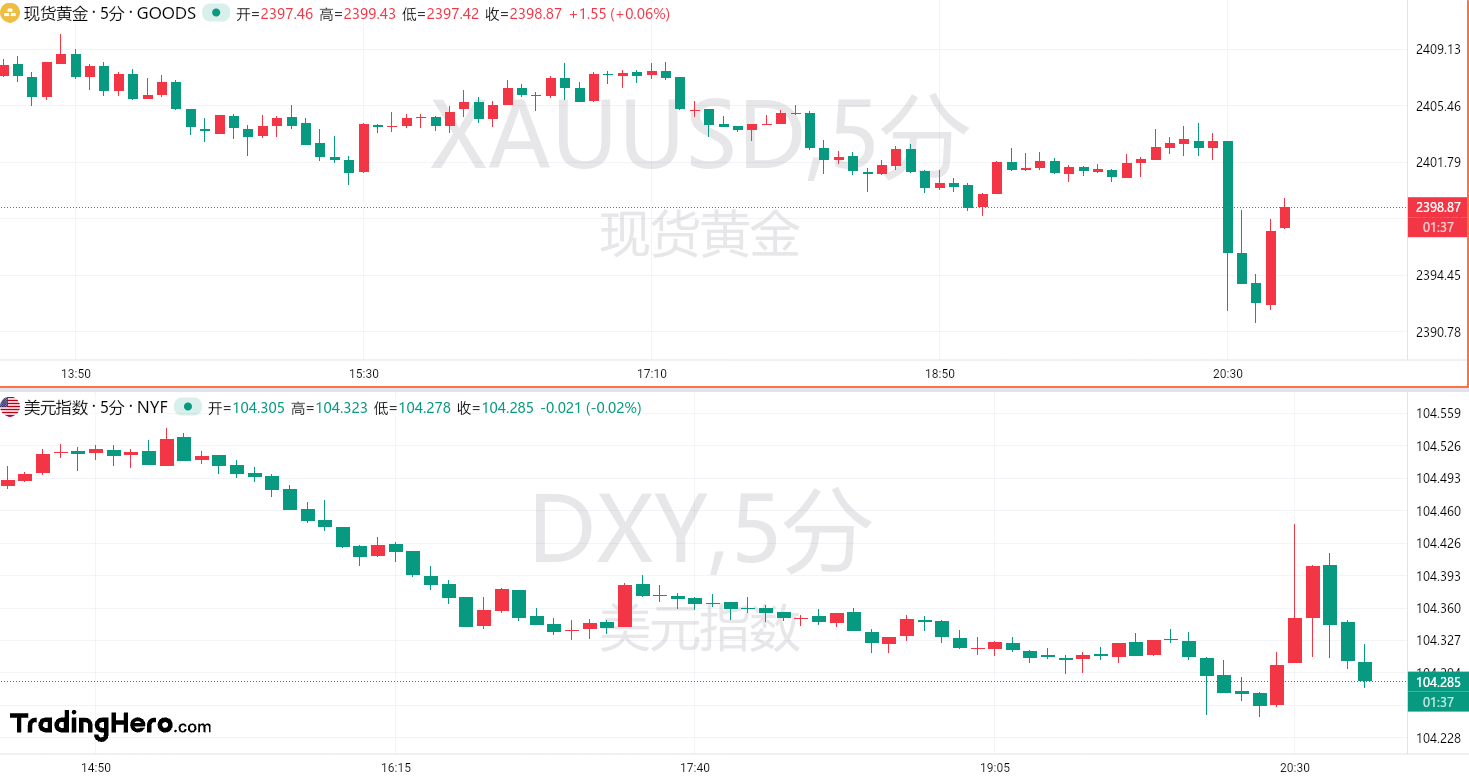 数据公布后,黄金短线急速跌破2400美元关口,现有所回升,白银日内一度跌幅扩大至3%,美元指数涨近20点,现有所回落。