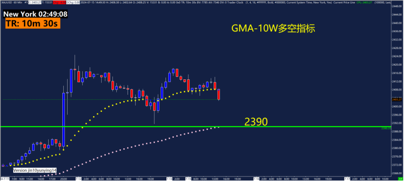 60分钟GMA-10W多空指标关键点位2390可以关注这些位置附近的10W多空指标的变化。10W多空指标是趋势追踪指标,当快线慢线变色之后形成交叉,那么趋势得以确认。快线慢线变色的位置需要特别留意,是否存在布局机会。