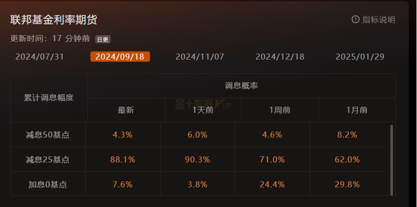 FEDWATCH显示,美联储9月降息25个基点的预期为88.1%,年底利率可能降至5%。