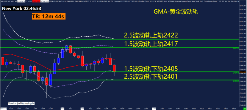 60分钟GMA-黄金波动轨指标关键点位2401、2405、2417、2422,可以关注这些位置附近的波动轨变化。黄金波动轨是依据波动率计算测算出来的,在震荡行情用法为触轨即可能反转!重点关注1.5倍波动轨和2.5倍波动轨位置。