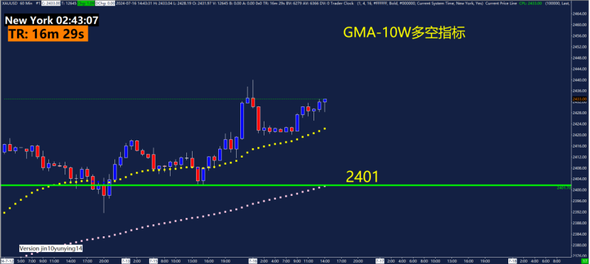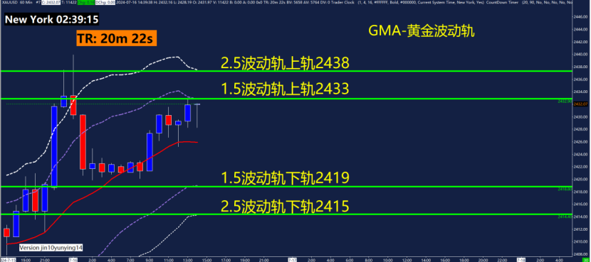 60分钟GMA-黄金波动轨指标关键点位2415、2419、2433、2438,可以关注这些位置附近的波动轨变化。黄金波动轨是依据波动率计算测算出来的,在震荡行情用法为触轨即可能反转!重点关注1.5倍波动轨和2.5倍波动轨位置。