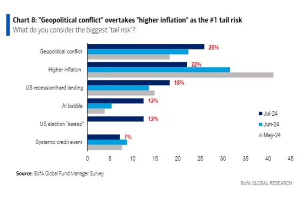 软着陆的呼声与基金经理目前评估市场风险平衡的方式一致。六个月来,通胀首次不再是受访者列出的头号风险,现在,他们重新将“地缘政治冲突”列为市场最大的风险,这种担忧上次位居榜首还是在1月份。