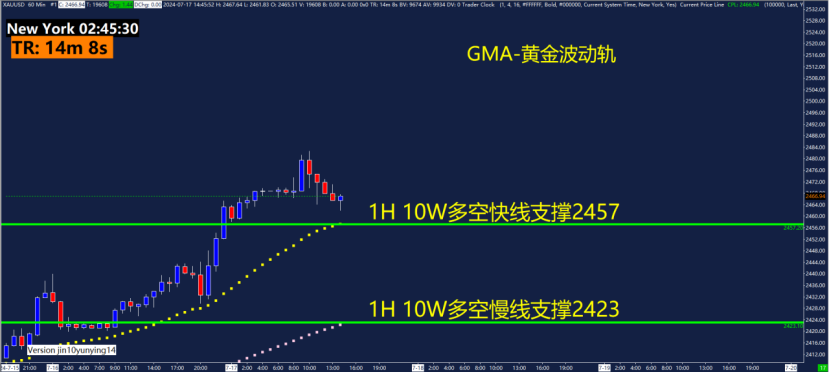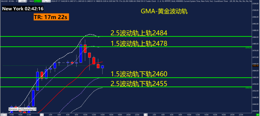 60分钟GMA-黄金波动轨指标关键点位2455、2460、2478、2484,可以关注这些位置附近的波动轨变化。黄金波动轨是依据波动率计算测算出来的,在震荡行情用法为触轨即可能反转!重点关注1.5倍波动轨和2.5倍波动轨位置。