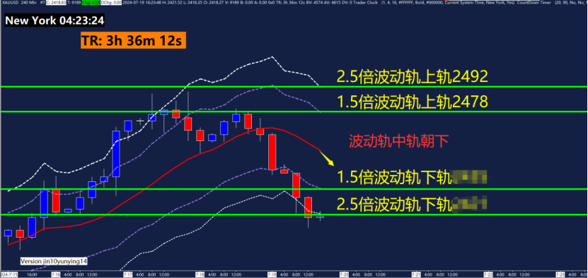 4小时黄金波动轨指标关键点位XXXX、XXXX、2478、2492。黄金波动轨主要用在震荡行情,运用波动轨中轨(红色线)判断是趋势还是震荡行情,中轨趋平则看做震荡行情,中轨朝下意味着4H级别趋势偏空。