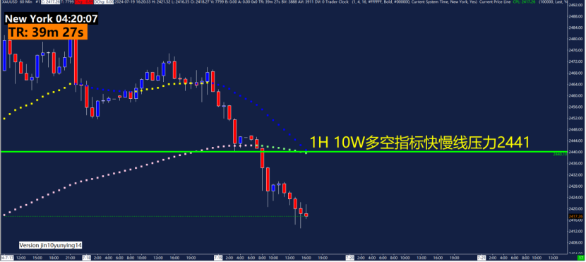 1小时10W多空指标快线以及慢线压力2441。10W多空指标主要用作趋势判断,运用快慢线颜色来判断趋势。4小时多头动能减弱,行情偏震荡,1小时快线蓝色趋势偏空,慢线绿色趋势偏空,短线有可能形成双空头,进而明确空头趋势。