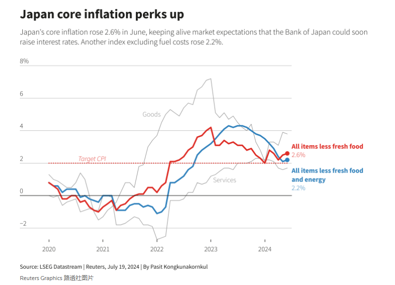 周五的数据显示,日本6月份核心通胀率连续第二个月加速上升,延续了两年多来高于日本央行2%目标的趋势,并支撑了市场对近期加息的预期。
