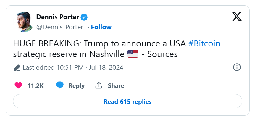 Porter援引内部消息称,在定于7月25日至27日举行的比特币2024大会上,将比特币列为战略储备资产已列入特朗普的议程。