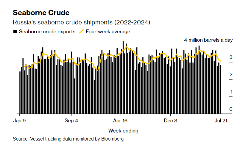 今年到目前为止,俄罗斯石油出口量较去年的平均水平下降了约3万桶/日,较4月份的峰值下降了62万桶/日。