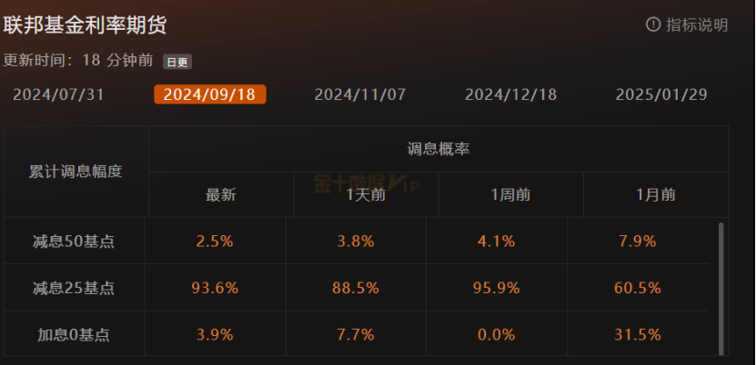 黄金ETF波动率指数自7月中旬的高点持续下降,表明市场情绪开始稳定,黄金价格波动减小。俄乌局势出现和平谈判的可能性,避险情绪下降。FEDWATCH显示,美联储9月降息25个基点的预期为93.6%,年底利率可能降至5%。
