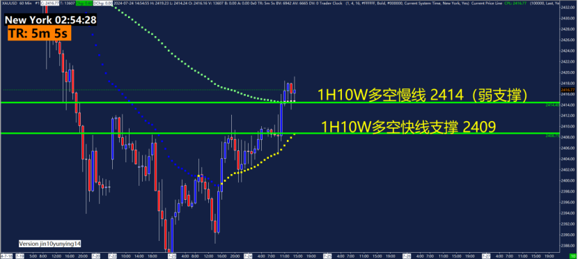 1小时10W多空指标快线支撑2409以及慢线弱支撑2414。10W多空指标主要用作趋势判断,运用快慢线颜色来判断趋势。4小时震荡偏多,1小时快线黄色趋势偏多,慢线粉色趋势偏多,短线还未形成双多头,短线按照震荡偏多格局观察。