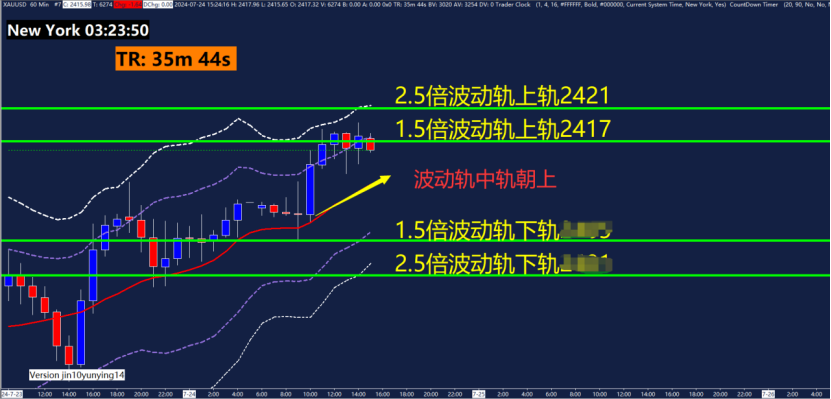 1小时黄金波动轨指标关键点位XXXX、XXXX 、2417、2421。黄金波动轨主要用在震荡行情,运用波动轨中轨(红色线)判断是趋势还是震荡行情,中轨朝上则看做震荡偏多行情。