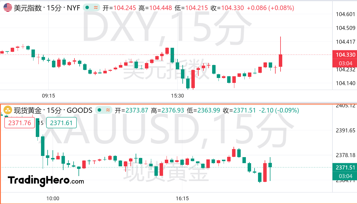数据公布后,美元指数短线拉升,最高触及104.45。现货黄金短线下挫9美元,一度重回2370美元关口下方。现货白银跌幅一度扩大至5%。非美货币集体回落,美元兑日元短线走高100点;欧元兑美元短线走低20点。