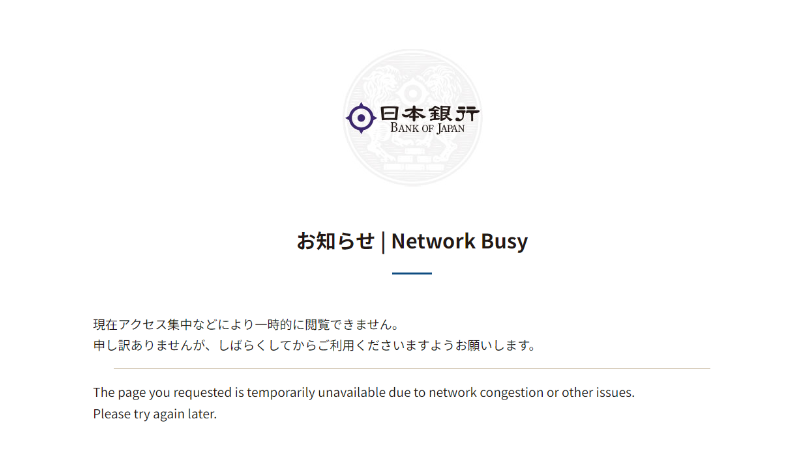 在当地时间中午12:56发布公告前的几分钟内,一些试图访问日本央行网站的人收到了一条信息,称由于“网络拥堵或其他问题”,该网站暂时无法访问。