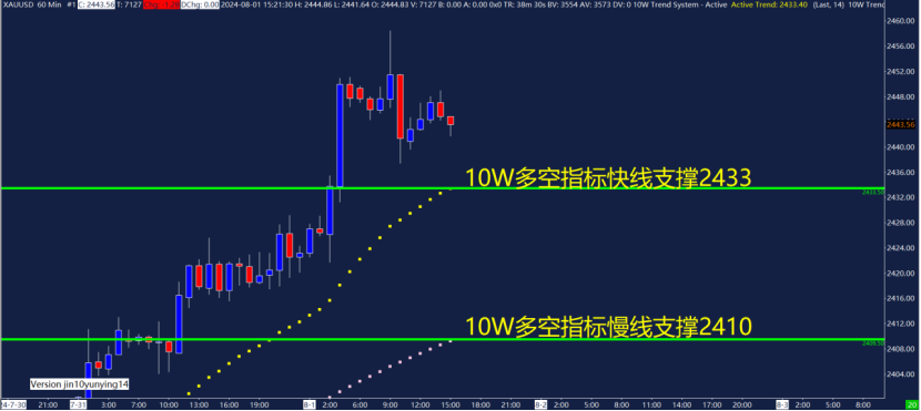 1小时10W多空指标快线支撑2433以及慢线支撑2410。10W多空指标主要用作趋势判断,运用快慢线颜色来判断趋势。4小时偏多,1小时偏多短线按照偏多格局观察。
