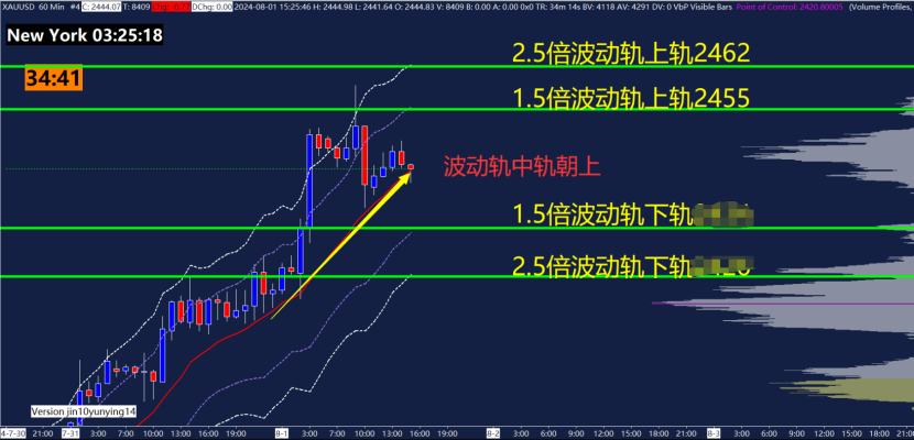 1小时黄金波动轨指标关键点位XXXX、XXXX 、2455、2462。黄金波动轨主要用在震荡行情,运用波动轨中轨(红色线)判断是趋势还是震荡行情,中轨朝上先看做震荡偏多行情。