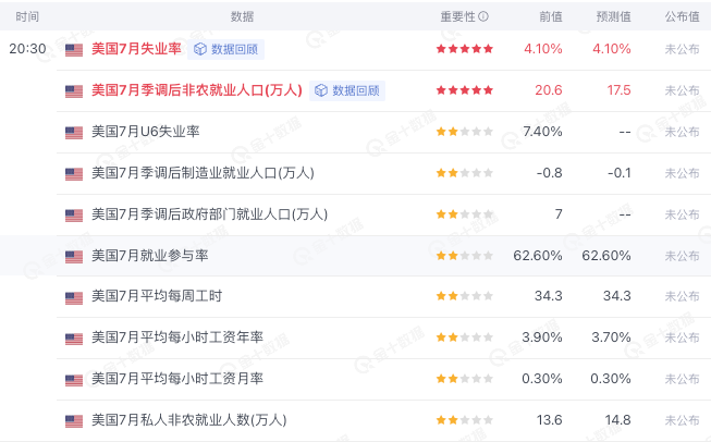 目前,市场预计美国7月季调后新增非农就业人口将录得17.5万人,失业率料将维持在4.1%,平均时薪年率料将录得3.7%,月率预期为0.3%,而劳动参与率预计维持在62.6%。