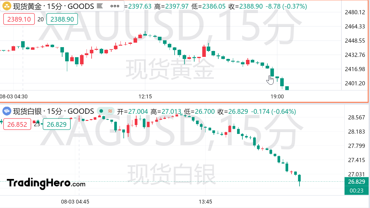 周一,随着交易员评估全球股市暴跌和中东紧张局势加剧,金价在震荡中走低,截至发稿跌破2390美元/盎司,为7月30日以来首次,日内大跌2%,较日高回落逾68美元。现货白银失守27美元关口,为5月6日以来首次,日内暴跌6%。