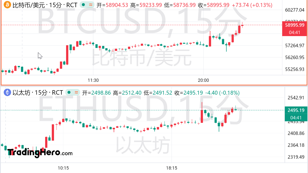 加密货币闻讯拉升,比特币突破59000美元/枚,创4日新高,日内涨超7%。以太坊回升至日内高点附近。