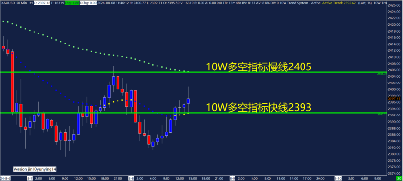 1小时10W多空指标快线压力2393以及慢线压力2405。10W多空指标主要用作趋势判断,运用快慢线颜色来判断趋势。4小时震荡偏空,1小时震荡,短线按照震荡格局观察。在1H级别震荡情况下,关注慢线压力2405附近博弈机会,如果行情强势上破2405,则转为看震荡行情。