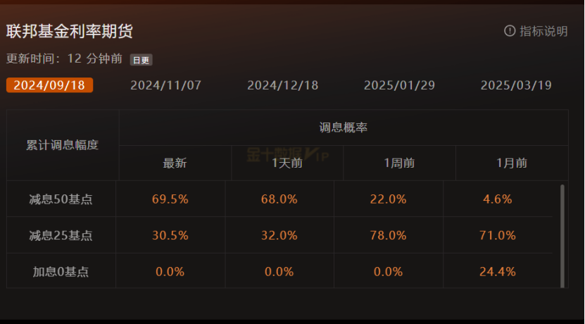黄金波动性在7月末随着经济衰退预期和中东局势发酵而升高,但目前波动率有所下行,市场情绪有所恢复。中国央行连续第三个月暂停增持黄金,但全球央行对黄金储备的长期需求预期仍然存在。FEDWATCH显示,美联储9月降息50个基点的预期为69.5%,年底利率可能降至5%。