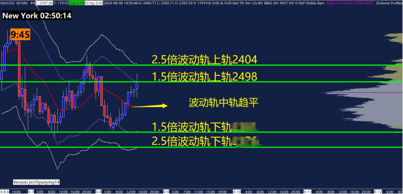 在震荡行情当中,则主要考虑行情运行到波动轨轨道附近的博弈反转机会。关注1.5倍波动轨下轨XXXX或者2.5倍波动轨下轨XXXX附近博弈多单的机会,如果是强势阴线运行到这一线则需要等待;上方关注2.5倍波动轨上轨2404附近的博弈空单机会,当前行情波动加剧需要严格控制风险。