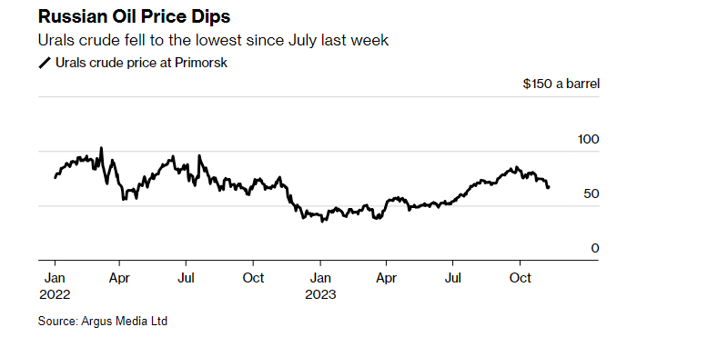 据Argus Media,上周波罗的海滨海港的乌拉尔原油估价回落至66.19美元/桶的低点,创7月25日以来的新低,早些时候,乌拉尔原油价格突破了七国集团为其设定的60美元/桶的价格上限制裁。由于对全球石油需求的担忧,布伦特原油价格近几周有所回落。