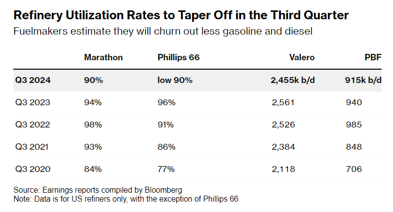美国最大的炼油厂所有者——马拉松石油公司计划本季度将其13家工厂的平均运行率保持在90%左右,这是自2020年以来该时期的最低水平。同样,PBF能源公司宣布其加工的原油量将降至三年内最少,菲利普66的炼油厂将以接近两年来的最低水平运行,而瓦莱罗能源公司预计将削减炼油加工量。