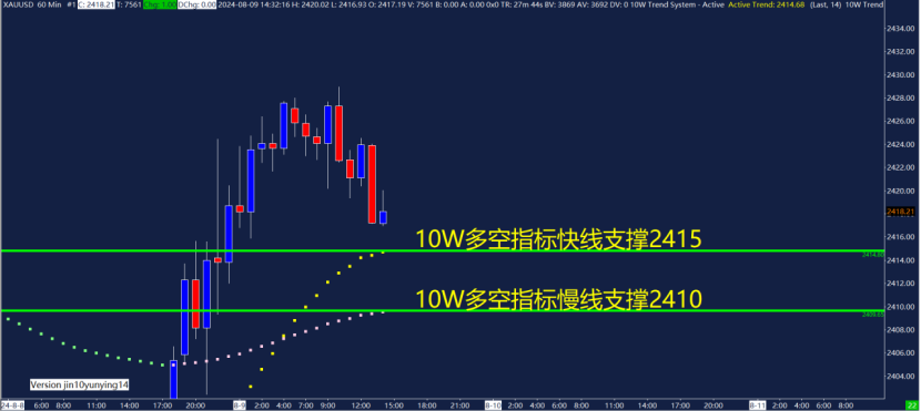 1小时10W多空指标快线支撑2415以及慢线支撑2410。10W多空指标主要用作趋势判断,运用快慢线颜色来判断趋势。4小时震荡,1小时震荡偏多,短线按照震荡偏多格局观察。在1H级别震荡情况下,关注慢线支撑2410附近博弈机会,如果行情强势下破2410,则转为看震荡行情。
