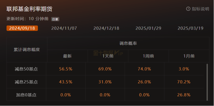 美国当周初请失业金人数低于预期,创一年来最大降幅,显示就业市场未快速恶化,缓解了市场对经济衰退的担忧。花旗意外经济指数小幅反弹,低点抬升,表明经济数据表现并未持续恶化,走弱速度缓解。FEDWATCH显示,美联储9月降息50个基点的预期为56.5%,年底利率可能降至5%。