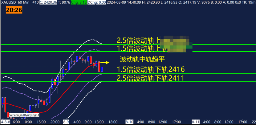 1小时黄金波动轨指标关键点位2411、2416、XXXX、XXXX 。黄金波动轨主要用在震荡行情,运用波动轨中轨(红色线)判断是趋势还是震荡行情,中轨接近趋平,先看做震荡行情。