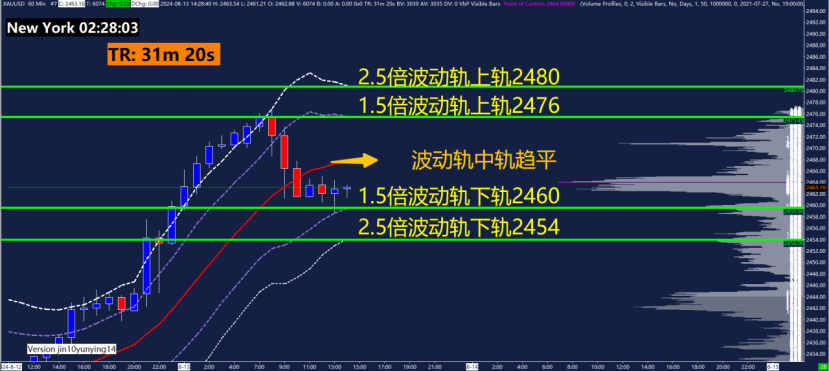 1小时黄金波动轨指标关键点位2454、2460、2476、2480。黄金波动轨主要用在震荡行情,运用波动轨中轨(红色线)判断是趋势还是震荡行情,中轨趋平,先看做震荡行情。