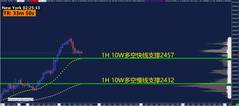 1小时10W多空指标快线支撑2457以及慢线支撑2432。10W多空指标主要用作趋势判断,运用快慢线颜色来判断趋势。4小时偏多,1小时偏多,短线按照震荡偏多格局观察。在1H级别震荡偏多情况下,关注慢线支撑2457附近博弈机会,如果行情强势下破2432,则转为看震荡行情。