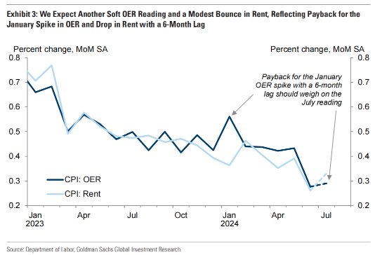 高盛预计,7月核心CPI环比将录得0.16%,稍低于市场的预期共识,同比将录得3.2%。另外,整体通胀方面,高盛预计7月环比将为0.17%,同比料将录得2.93%,均低于市场预期共识。因高盛预计食品价格将上涨0.15%、能源价格将上涨0.4%,因此预测不包括租金和业主等价租金的核心服务通胀将上升0.15%。图1提供了高盛预测的各组成部分的总结。