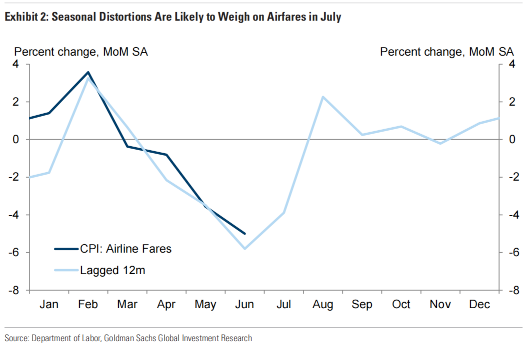 高盛预计,美国机票价格在7月份下降2.5%。尽管高盛股票分析师的在线机票价格指标上月大致保持不变,但高盛怀疑季节性因素可能会拖累7月的数据。