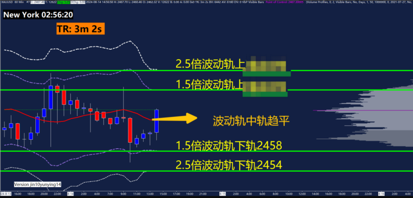 1小时黄金波动轨指标关键点位2454、2458、XXXX、XXXX 。黄金波动轨主要用在震荡行情,运用波动轨中轨(红色线)判断是趋势还是震荡行情,中轨趋平,先看做震荡行情。