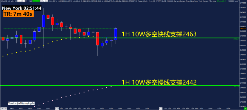 1小时10W多空指标快线支撑2463以及慢线支撑2442。10W多空指标主要用作趋势判断,运用快慢线颜色来判断趋势。4小时偏多,1小时偏多,短线按照震荡偏多格局观察。在1H级别震荡偏多情况下,关注快线支撑2463附近博弈机会,如果行情强势下破2442,则转为看震荡行情。