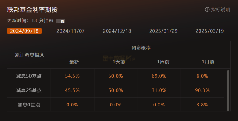 美国7月PPI年率同比上涨2.2%,低于预期和前值,通胀压力有所缓解。FEDWATCH显示,美联储9月降息50个基点的预期为54.5%,年底利率可能降至5%。今晚重点关注CPI数据。