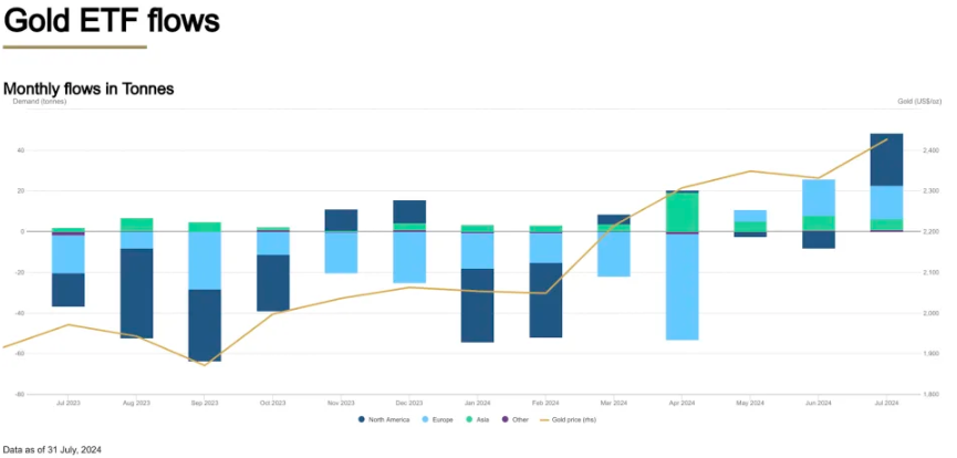 值得注意的是,全球实物支持的黄金ETF连续三个月出现资金流入,因为西方投资者涌入黄金,其中北美地区的黄金ETF资金流入在7月份超过了欧洲和亚洲。