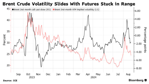 彭博资讯首席衍生品策略师Tanvir Sandhu表示,看跌期权的倾斜度加大,表明投资者认为油价飙升的风险较低。对需求增长停滞的担忧与地缘政治风险相互抵消,可能会导致价格波动较小。这种情况在八月份之前出现过,当时的波动率达到多年低点。