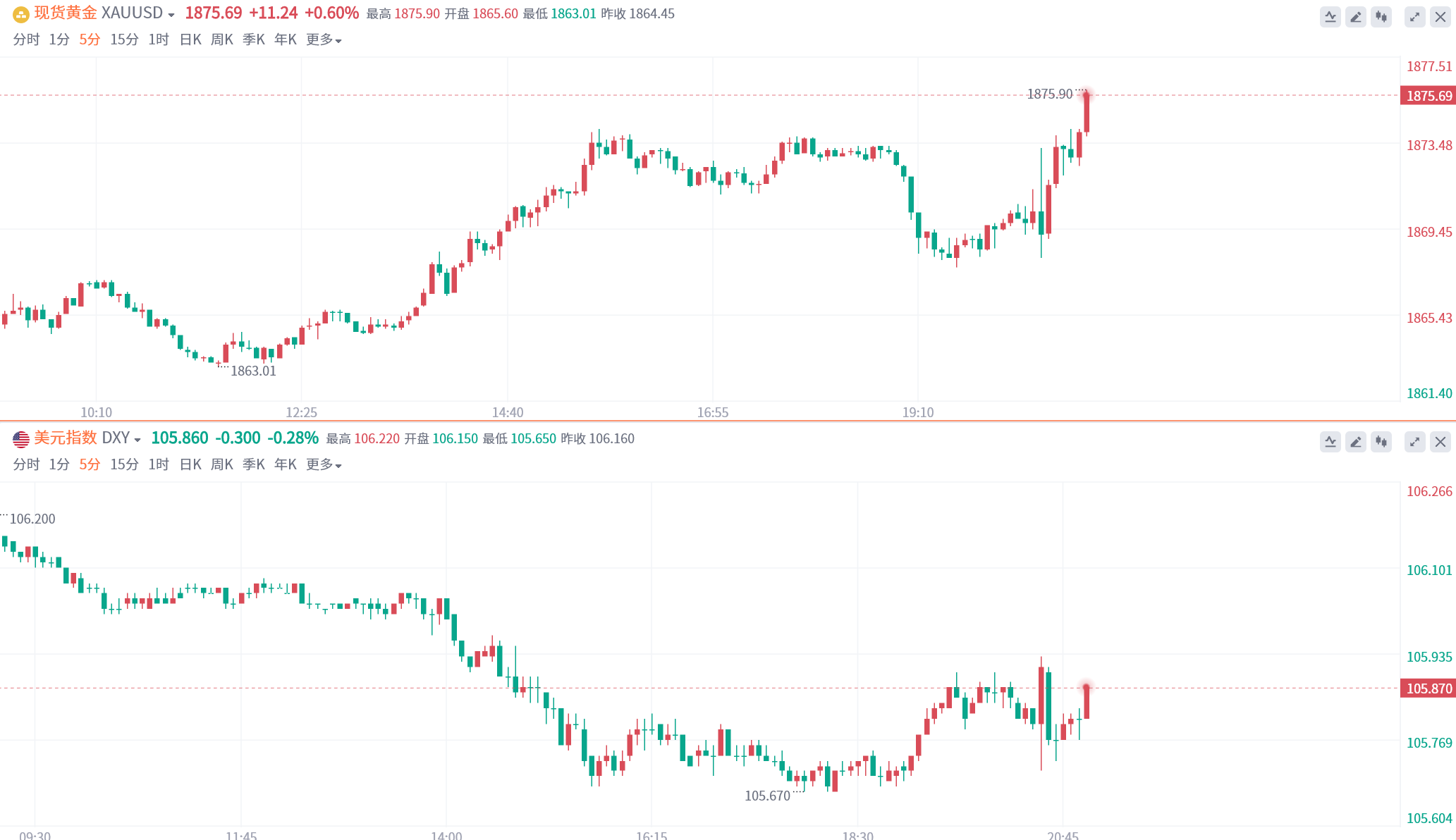 数据公布后,美元指数短线走低近10点。现货黄金涨幅扩大至6美元,报1875.91美元/盎司。现货白银日内涨幅扩大至4%,现报23.53美元/盎司。COMEX期银日内涨幅扩大至4.00%,现报23.66美元/盎司。
