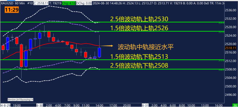 1小时黄金波动轨指标关键点位2488、2492、2506、2510。黄金波动轨主要用在震荡行情,运用波动轨中轨(红色线)判断是趋势还是震荡行情,中轨稍稍偏下,先看做震荡谨慎偏空行情。