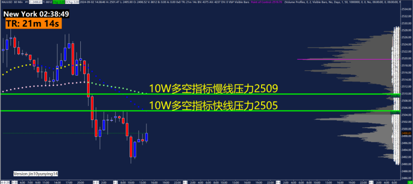 1小时10W多空指标快线压力2505以及慢线压力2509。10W多空指标主要用作趋势判断,运用快慢线颜色来判断趋势。4小时震荡,1小时偏空,短线按照震荡偏空格局观察。
