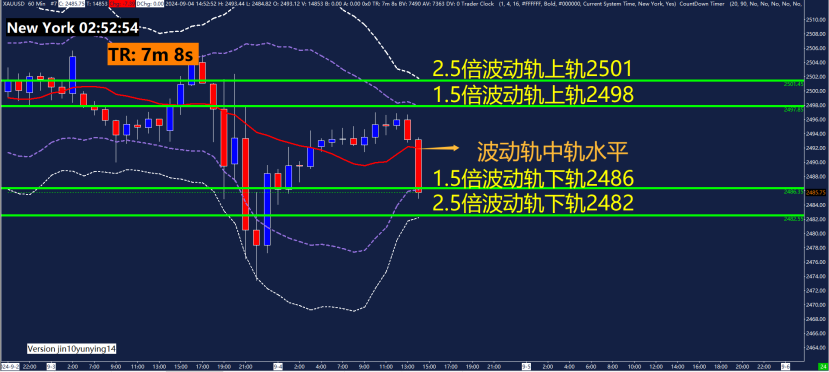 1小时黄金波动轨指标关键点位2482、2486、2498、2501。黄金波动轨主要用在震荡行情,运用波动轨中轨(红色线)判断是趋势还是震荡行情,中轨水平,先看做震荡行情。