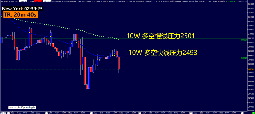 1小时10W多空指标快线压力2493以及慢线压力2501。10W多空指标主要用作趋势判断,运用快慢线颜色来判断趋势。4小时震荡,1小时偏空,短线按照震荡偏空格局观察。在1H级别震荡偏空情况下,关注快线压力2493以及慢线支撑2501附近博弈机会。