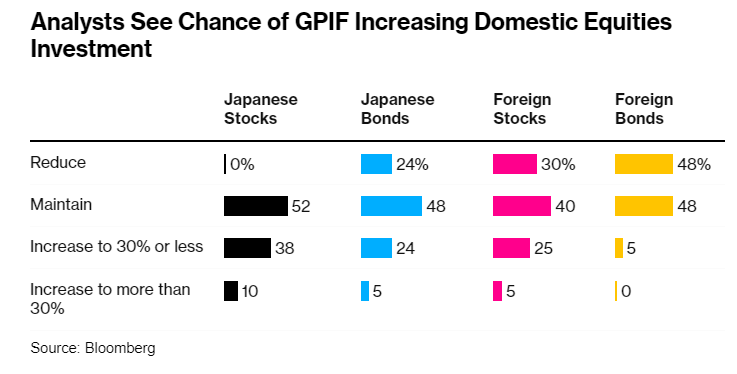彭博社的一项调查显示,资产规模高达1.75万亿美元的日本政府养老金投资基金(GPIF)可能会加大对国内股票的购买力度,并缩减对外国债券的重新配置,此举将波及全球市场。