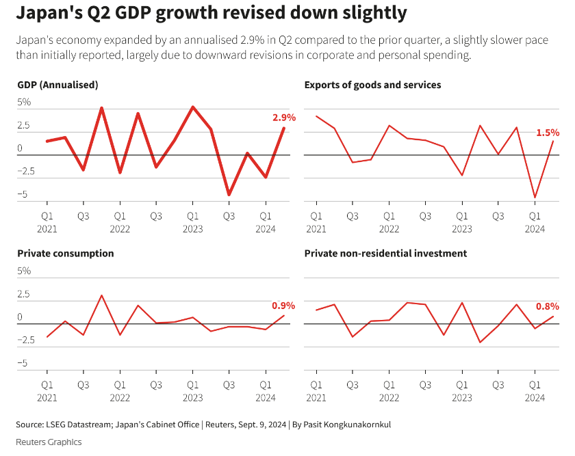 日本第二季度经济增速略低于最初报告的增速,因企业和家庭支出下调, 这表明其下半年的消费前景和央行的加息计划更加崎岖不平。