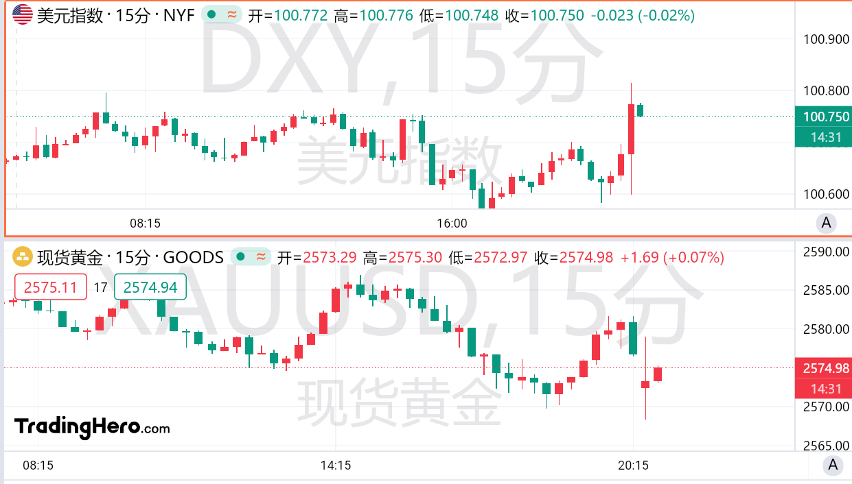数据公布后,美元指数短线上扬近20点,现货黄金短线走低8美元,一度跌破2570美元,随后迅速反弹。