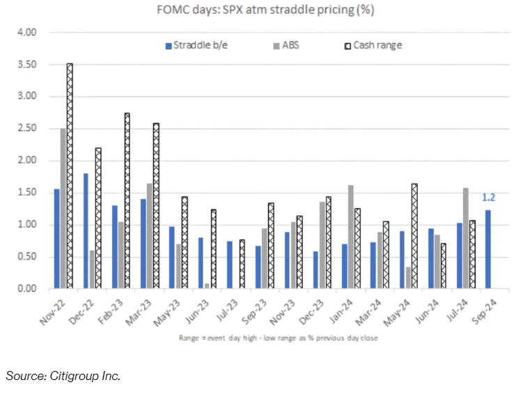 花旗集团表示,这种不确定性是期权市场押注标普500指数将在美东时间周三美联储做出利率决议后将向任一方向波动1.2%的原因,这一预期波动率是基于当天的平价跨式组合的价格计算得出的。这是自2023年3月美联储政策会议以来最高的隐含波动率,当时华尔街正处于区域性银行危机之中。