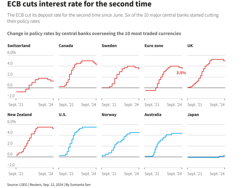 随着交易员对美联储将于下周三开始连续降息的信心大大增强,市场关注的焦点是欧洲央行与其他同行的分歧将如何影响市场。